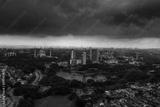 Dark and grey dramatic thunderstorm clouds over the big city with tall buildings and mosque in Asia.