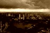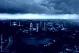 Dark and grey dramatic thunderstorm clouds over the big city with tall buildings and mosque in Asia.