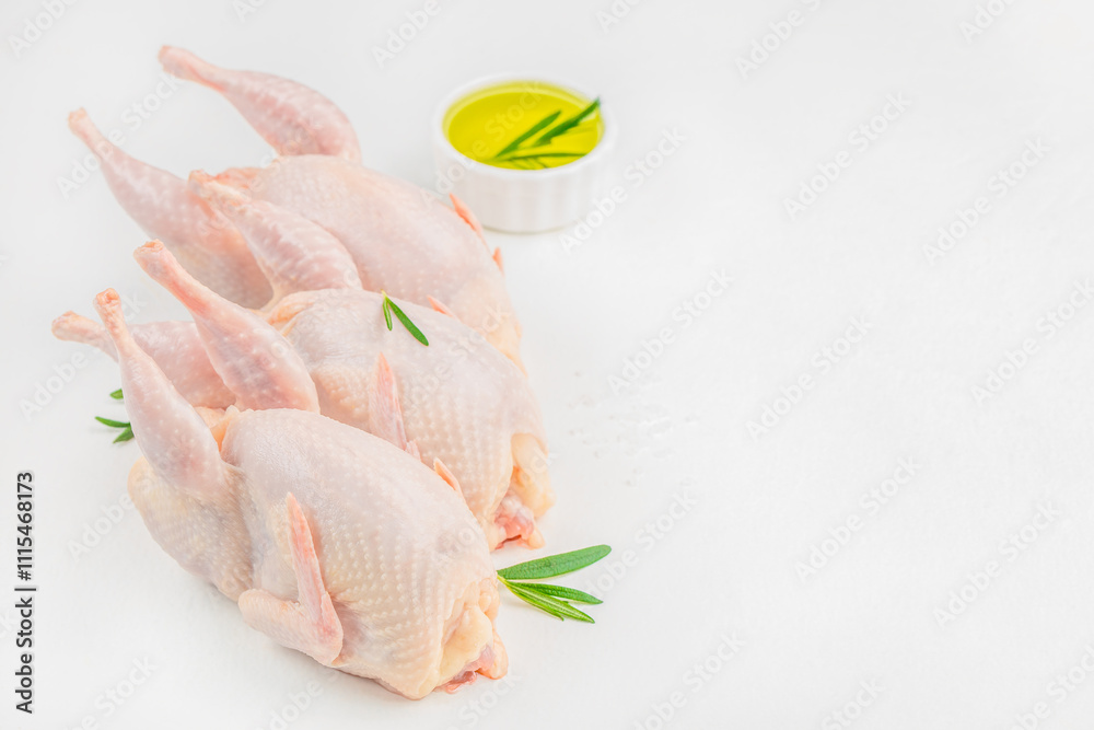 Fresh organic quails on a white background top view. copy space. concept of ecological farm products