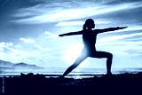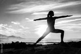 Silhouette of fitness athlete practicing warrior II yoga pose meditating at beach sunset. Woman stretching doing morning meditation against colorful sky background. Zen wellness and wellbeing concept.
