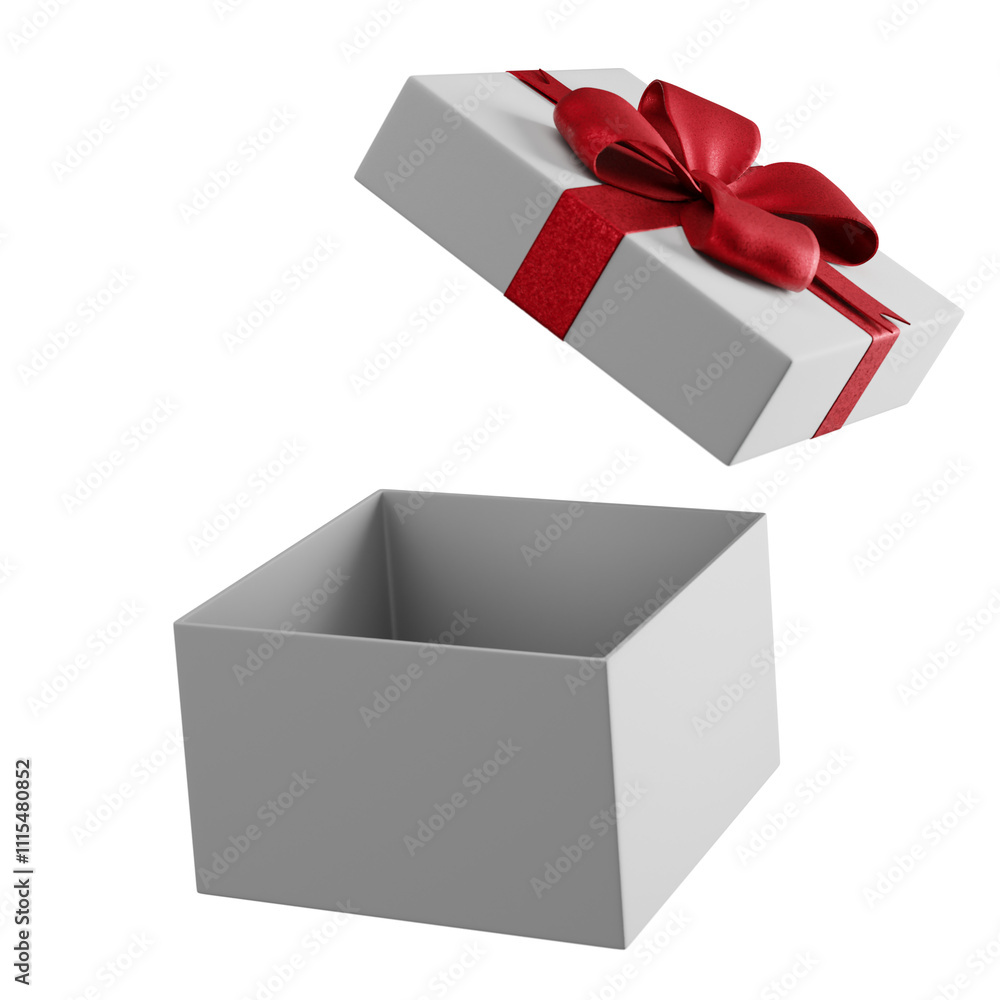 White gift box with red ribbon isolated on empty background. Christmas present for holiday sale shop design element.