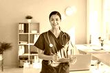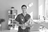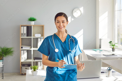 Portrait of a young pretty happy smiling female doctor in blue medical uniform standing in her office. Confident woman physician holding report file with appointment and looking at the camera.