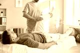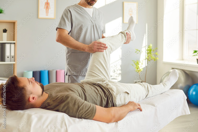 Male physical therapist doing healing treatment on mans knee in rehabilitation clinic. Professional physiotherapist or osteopath working in office. Physiotherapy and osteopathic medicine concept.