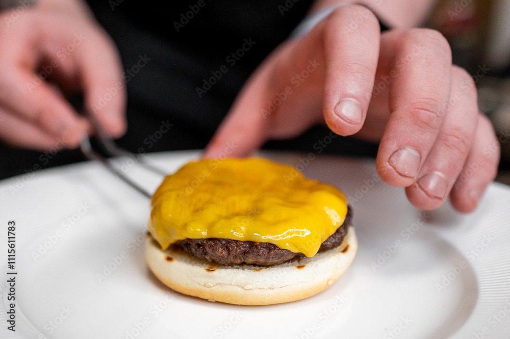 A close-up shot of a hand placing a slice of melted cheddar cheese on top of a cooked burger patty resting on a hamburger bun, highlighting the process of making a delicious cheeseburger.