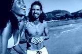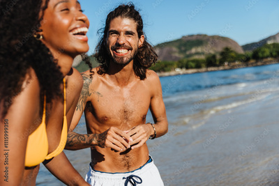 Joyful couple enjoying a sunny day at Praia do Flamengo beach with scenic views of the ocean and nature