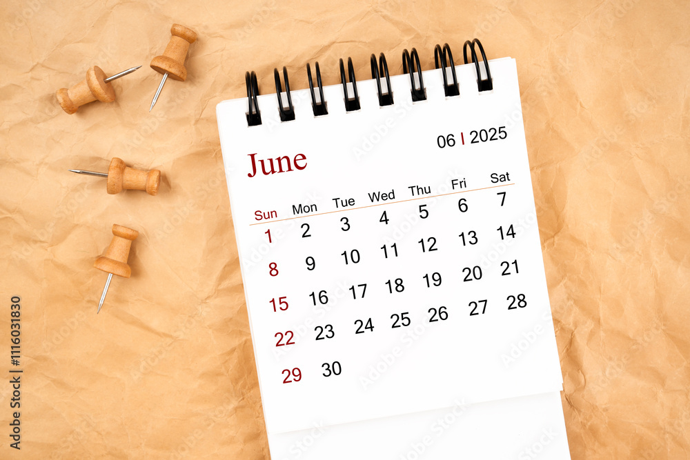 June 2025 white desk calendar with wooden thumbtack on old crumpled paper.