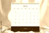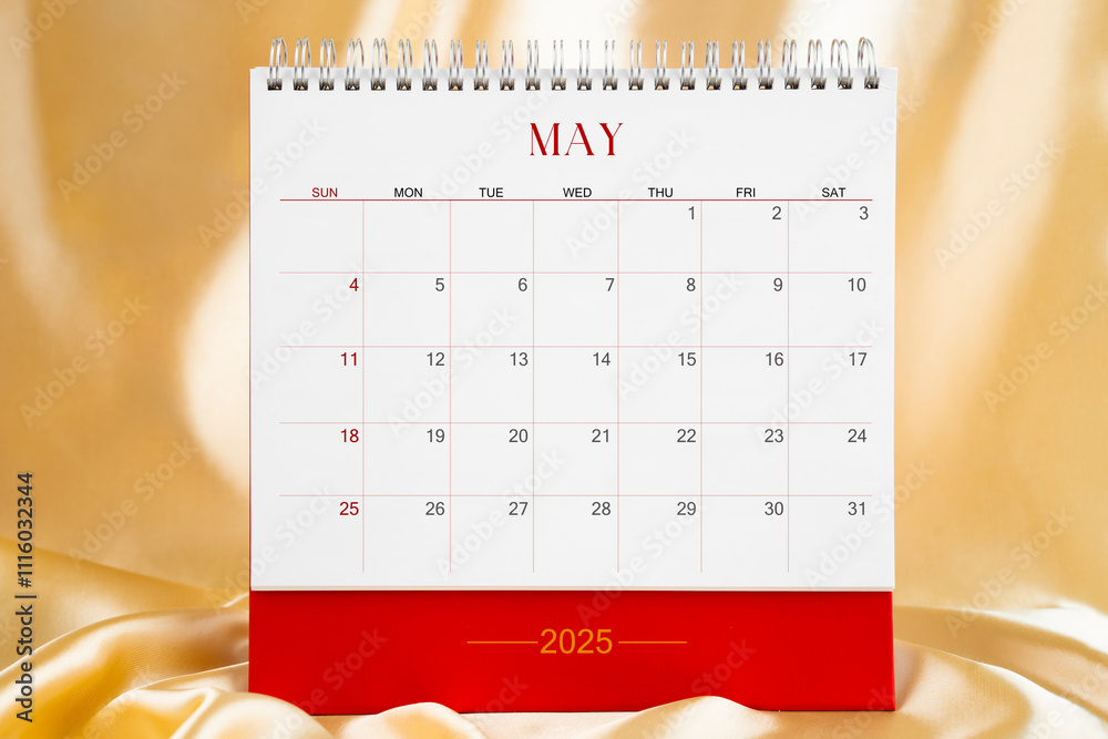 May Desk calendar for 2025 year on gold color silk background. Blank calendar.