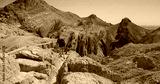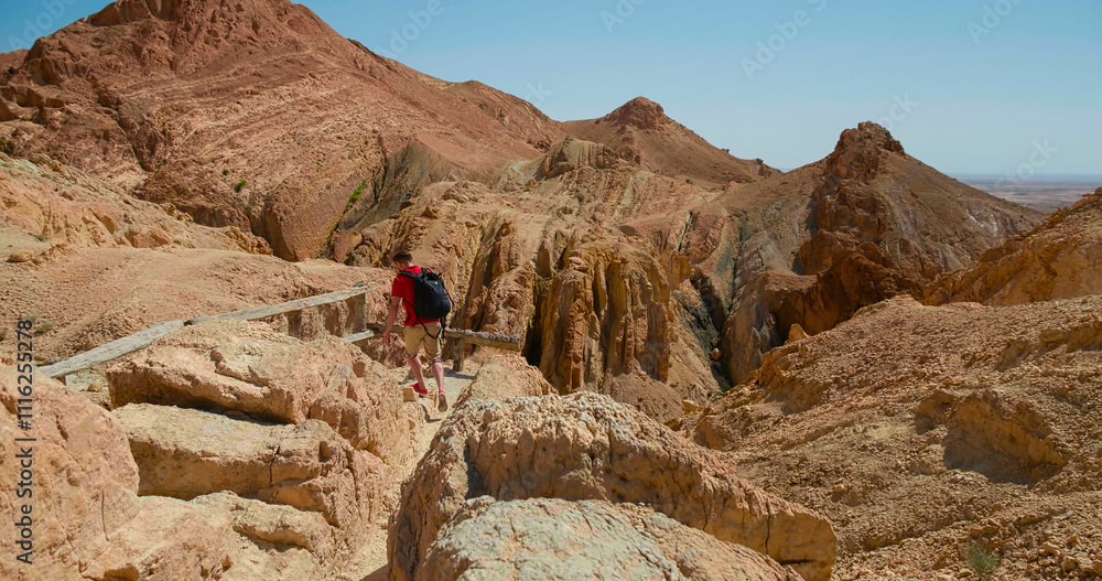 Man with backpack hiking narrow slot canyon in Sahara going down the path. Travelling to the desert in Tunisia. Holiday travelling concept