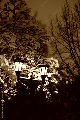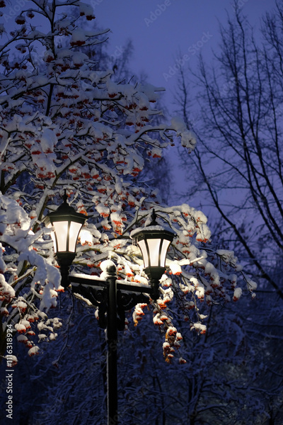 beautiful winter evening landscape with lantern and snow covered rowan tree. frozen cold weather. christmas, new year holidays. Dark atmospheric winter cityscape. fairy tale atmosphere in winter time