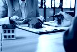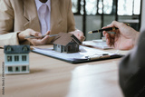 Businessman and real estate agents discussing documents signing a legal purchase of a house.