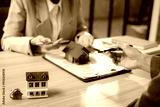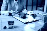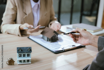 Businessman and real estate agents discussing documents signing a legal purchase of a house.