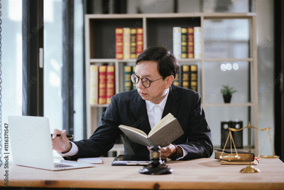 Male lawyer working at desk in office, focusing on gavel and weighing justice.