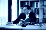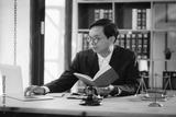 Male lawyer working at desk in office, focusing on gavel and weighing justice.