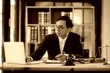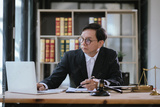 Male lawyer working at desk in office, focusing on gavel and weighing justice.