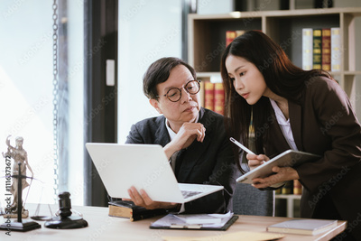 Consultation and conference of Male lawyers and professional businesswoman working and discussion having at law firm in office. Concepts of law, Judge