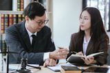 Consultation and conference of Male lawyers and professional businesswoman working and discussion having at law firm in office. Concepts of law, Judge