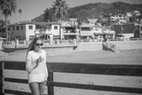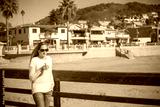 Beautiful woman drinking her morning coffee walking along boardwalk