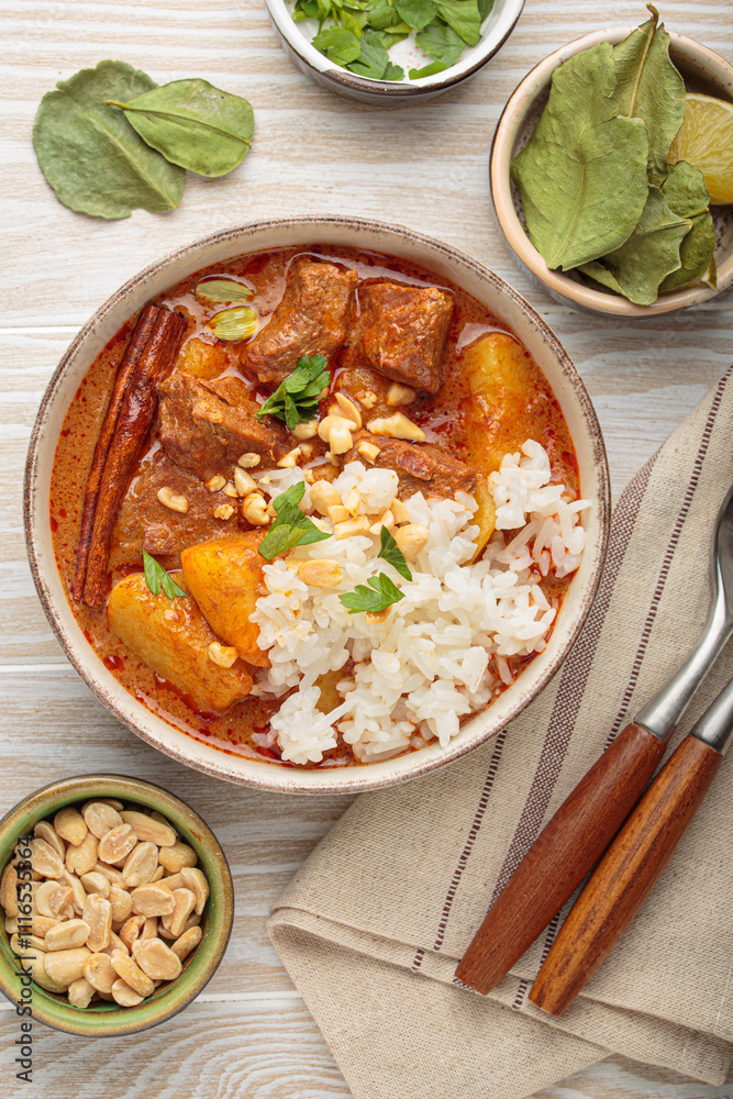 Aromatic massaman curry, a staple of thai cuisine, with tender beef, potatoes, and fluffy rice, garnished with peanuts and fresh herbs, a vibrant and flavorful dish of Thailand
