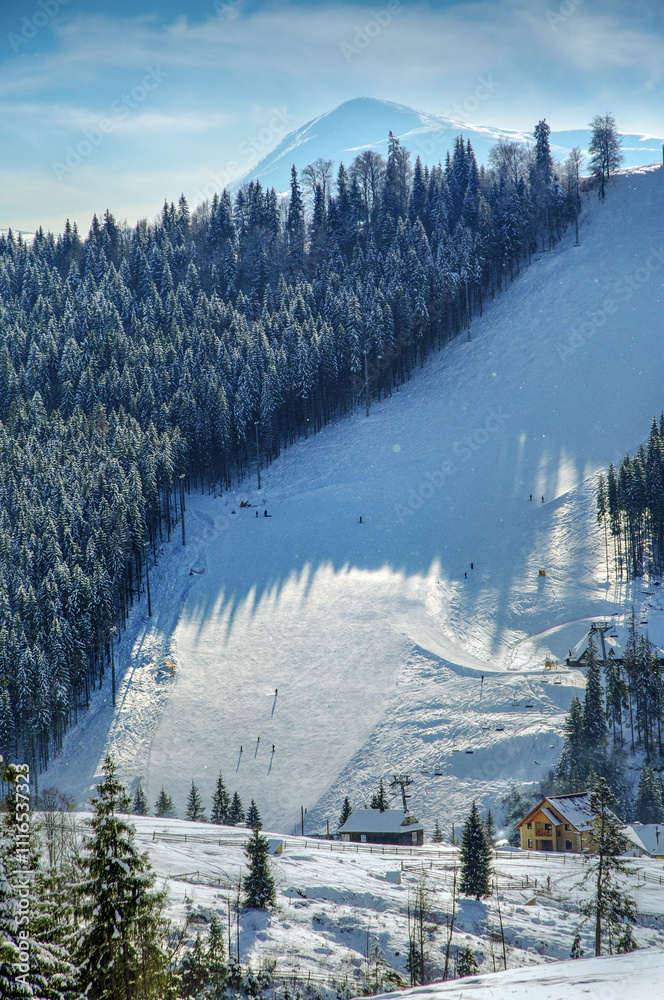 snowy slopes and fir trees, mountain peak on the horizon, ski track, landscape at a ski resort