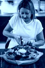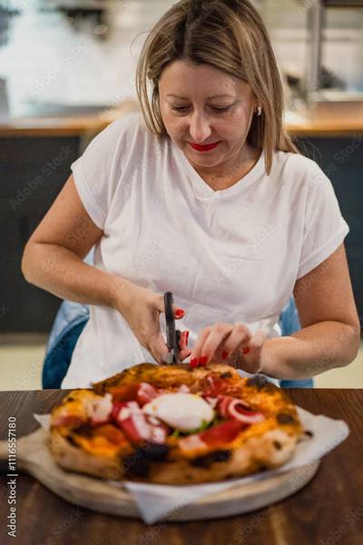 Beautiful mature woman cutting pizza with cured ham and burrata on wooden board into pieces