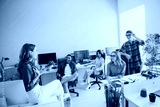 Photo of happy smiling students talking enjoying business school studying indoors workplace workstation