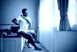 Mid adult man holding his back and shoulder in pain after waking up in morning.