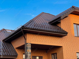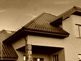Roof made of black metal tiles. Drainage system