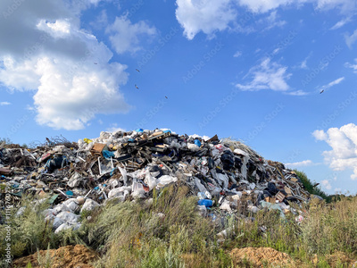 A pile of garbage in the middle of a field. A poorly organized landfill
