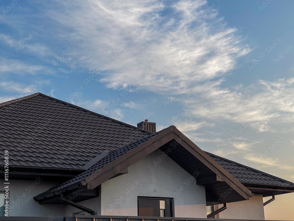 Metal roof design. Roof flashing newly built roof using metal tiles.