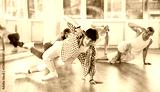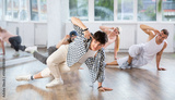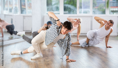 Young man dances hip hop with friends during workout. Young people perform basic important elements in deep squat, as if they are doing push-ups, bending their whole body