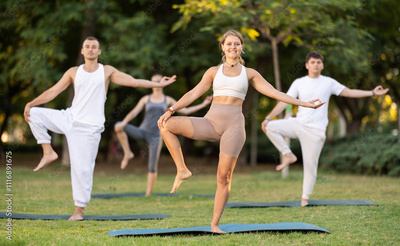 Hatha yoga coach conduct leading rehearsal for girls and guys in park, show example of performing exercises, do fulfil Parivritta Hasta Padangushthasana. People practice sport during yoga workout in