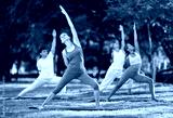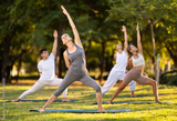 Hatha yoga teacher conduct leading rehearsal for girls and guys in park, show example of performing exercises, do fulfil virabhadrasana. People practice sports during yoga workout in nature