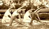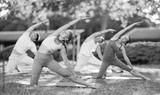 Hatha yoga female teacher conduct leading rehearsal for girls and guys in park, show example of performing exercises, do fulfil Parighasana. People practice sport during yoga workout in nature