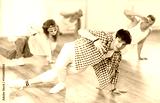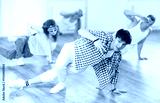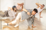Young man dances hip hop with friends during workout. Young people perform basic important elements in deep squat, as if they are doing push-ups, bending their whole body