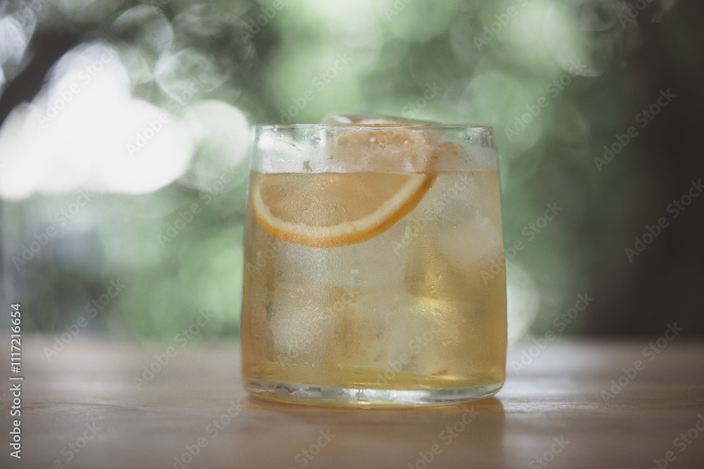 Homemade ice honey lemon in a glass with slice lime fruit on wooden table with a blurred garden background.