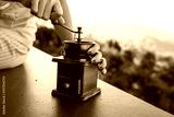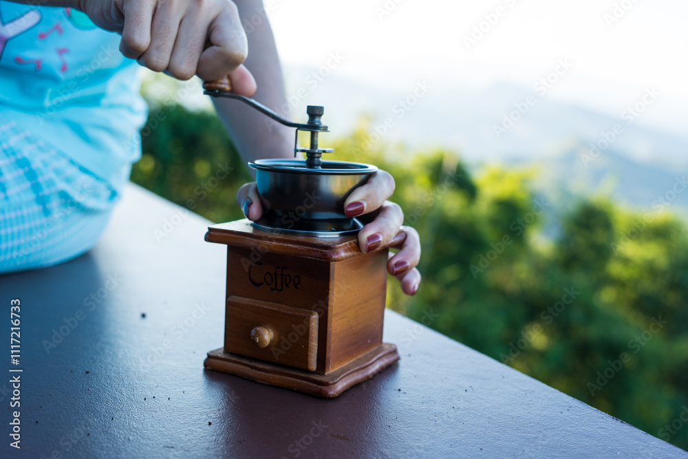 A young woman making coffee with old fashioned coffee grinder, morning activities during camping