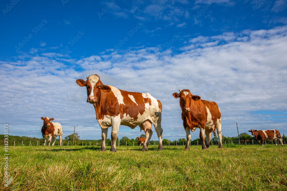 Troupeau de vaches laitières au milieu des champs et de l'herbe verte au printemps.