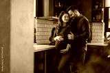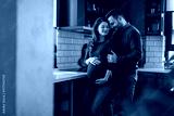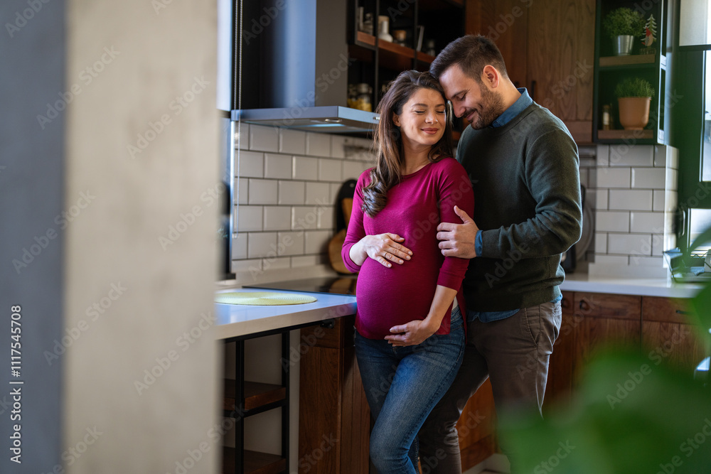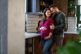 Man in love hugs his pregnant wife, they are waiting together for the baby's arrival. Love, family