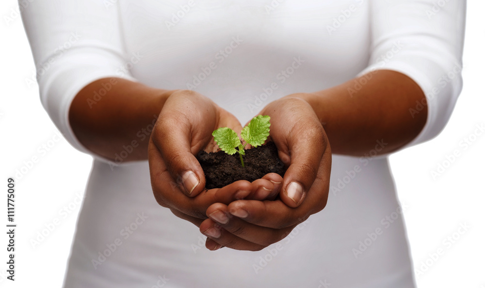 african american woman hands holding plant in soil