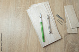balsa wood, crafting hand tools jigsaw, knife and drill arranged on workbench, crafting essentials