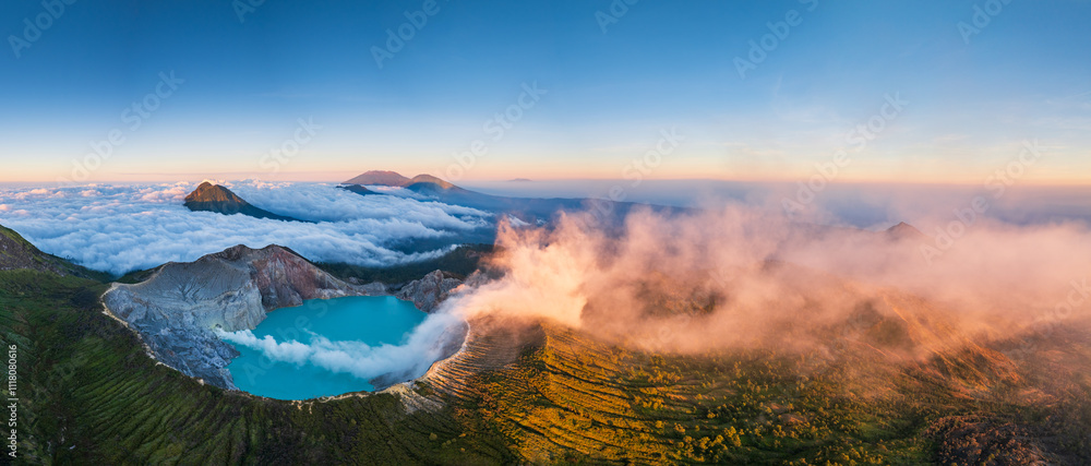Aerial panorama drone view of mount Kawah Ijen volcano crater at sunrise, East Java, Indonesia