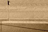 Yellow brick wall at the roadside with a pedestrian crossing sign on the left. Sidewalk and asphalt road in front. Background for copy space.
