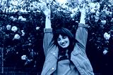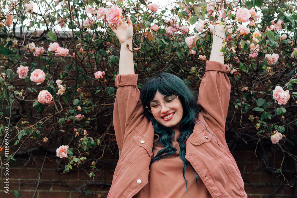 portrait of young hipster woman with color hair in mocha color dress and flower shaped sunglasses on blooming roses bush background. Urban street fashion. Fun, positive mood Color of the 2025 year.