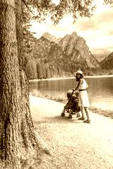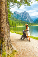 Mother walking with baby stroller along lake dobbiaco in the dolomites