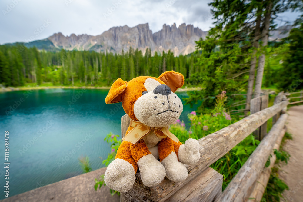 Plush dog enjoying the scenic view of lake carezza and the dolomites