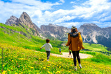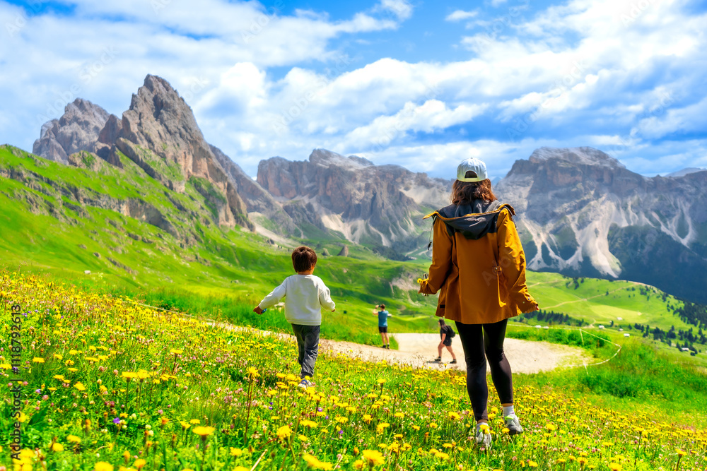 Tourists walking in seceda, dolomites, italy, during summer vacation