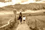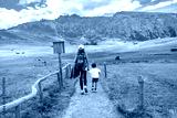 Mother and child hiking in the dolomites at alpe di siusi in summer