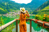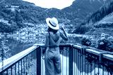 Tourist enjoying the view of alleghe village and lake in the dolomites, italy