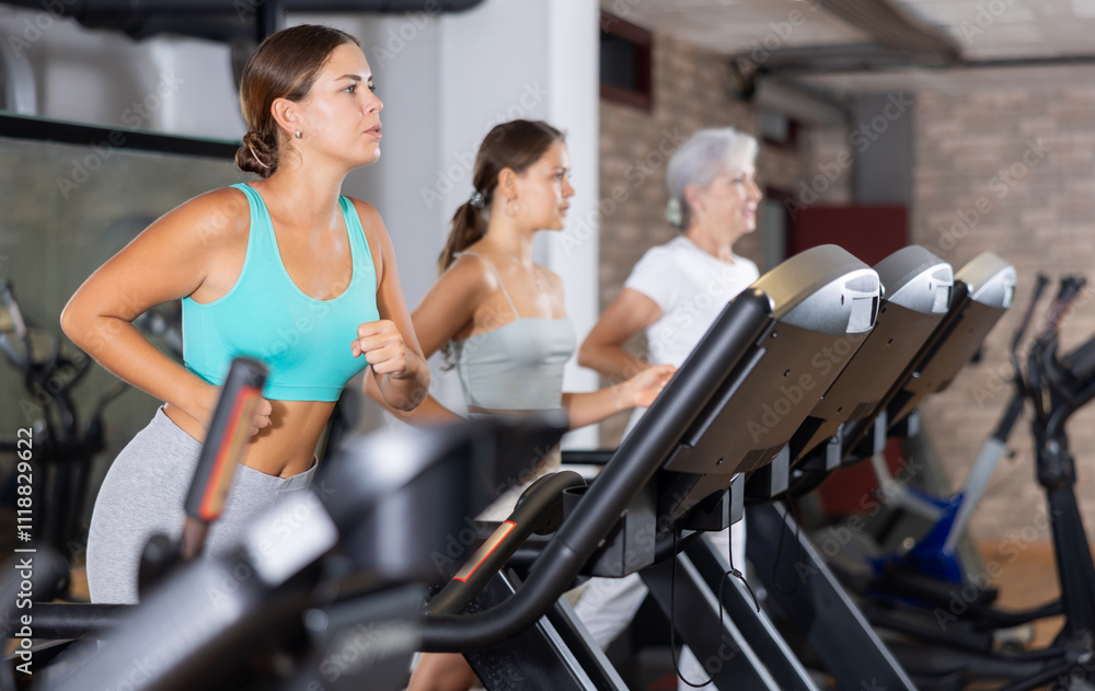 Focused motivated young girl leading healthy active lifestyle doing cardio workout in gym, running on treadmill