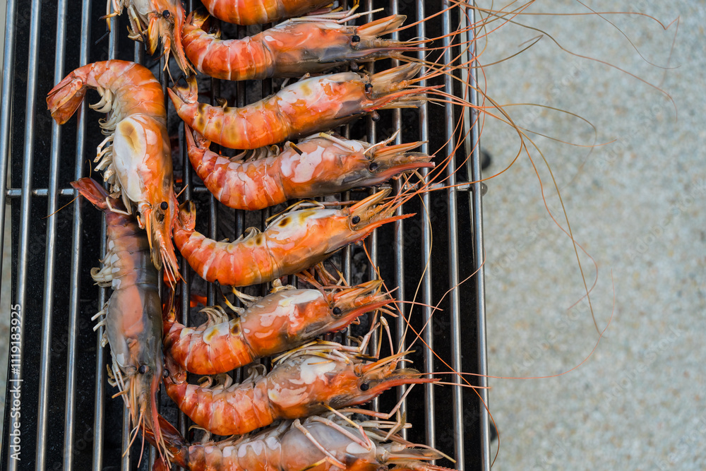 Fresh river prawns grilled over charcoal fire, being burned to turn orange
